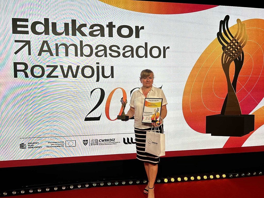Z wielką radością informujemy, że podczas gali Edukator – Ambasador Rozwoju, która odbyła się 24 czerwca 2025 r., Arleta Radomska otrzymała wyróżnienie w Subregionie Konińskim ! Pani Arleta została nominowana do tego prestiżowego tytułu przez Centrum Wsparcia Rzemiosła, Kształcenia Dualnego i Zawodowego w Koninie (CWRKDiZ). To uhonorowanie za zaangażowanie, pasję i nieustanny wkład w rozwój edukacji zawodowej oraz wspieranie młodych talentów.