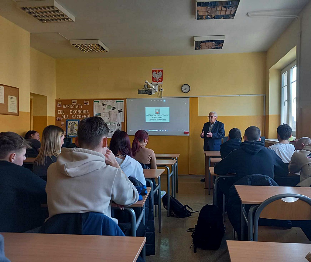 W dniu 07.03.2024r. gościliśmy w naszej szkole pana Piotra Rybczyńskiego – Kierownika konińskiego oddziału Archiwum Państwowego w Poznaniu. Tematem prelekcji była: ”Historia powstania Państwowej Policji od roku 1919” Biorąca udział w spotkaniu klasa 3P zdobyła wiedzę o historii konińskiej policji. Dziękujemy za poświęcony czas.