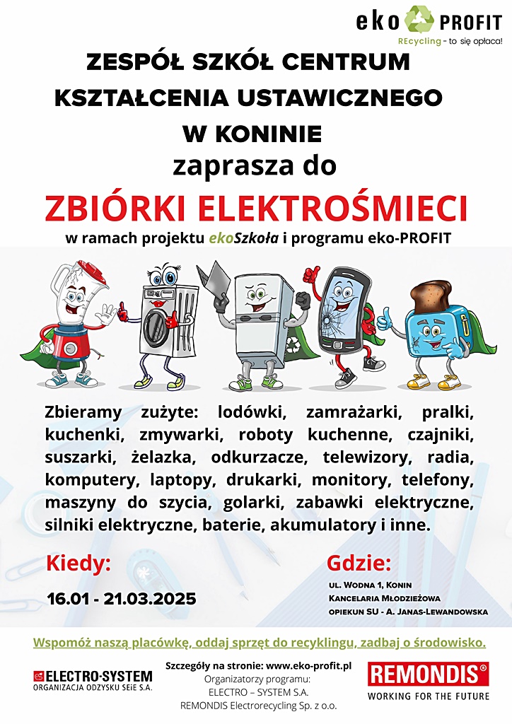 W ramach programu eko-PROFIT – REcycling to się opłaca! bierzemy aktywny udział w podnoszeniu świadomości ekologicznej uczniów w zakresie zagospodarowania zużytego sprzętu elektrycznego, elektronicznego oraz baterii i akumulatorów. Przyczyniamy się do właściwego wykorzystania odpadów, a dodatkowo pozyskujemy fundusze. Zbiórka na terenie szkoły do 21 marca 2025 r.