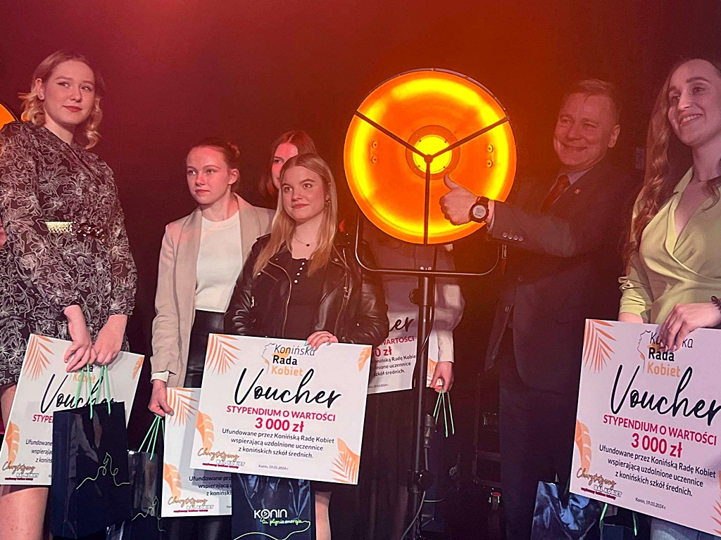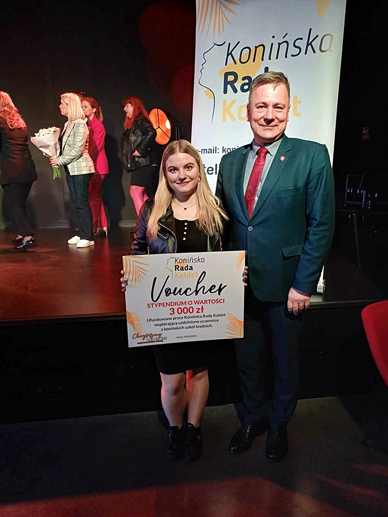 We wtorek 19.03.2024 r. w Domu Kultury Oskard, Konińska Rada Kobiet przyznała stypendia uzdolnionym uczennicom. Jedną z dziewięciu wyróżnionych jest Marcelina Błaszczyk, uczennica kl. 5Ep . Z rąk Prezydenta Konina -Piotra Korytkowskiego ,odebrała stypendium w wysokości 3000,00 złotych. Marcelina została wyróżniona za swój talent wokalny, który cały czas doskonali w naszym szkolnym zespole muzycznym „Midway”.