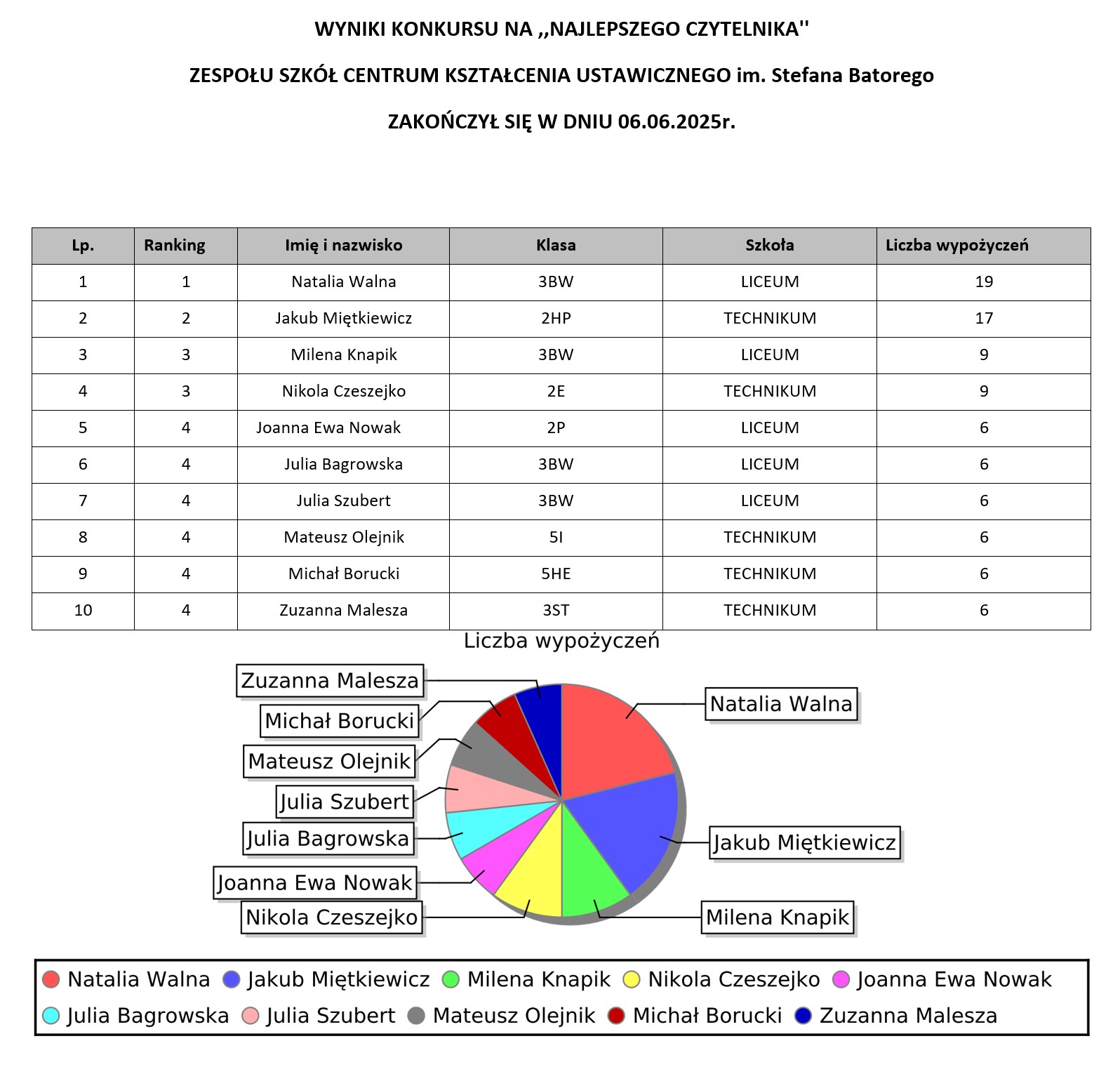 WYNIKI KONKURSU NA ,,NAJLEPSZEGO CZYTELNIKA'' Aktualności / 05-06-2025 Dodane przez webadmin10 - June 5, 2025 Konkurs